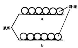 图8-1-24 基布的辊涂 底涂基布的上浆量对人造革质量有较大的影响,一般以基布上涂有薄薄一层浆料为最佳。上浆量过大,浆料过多地渗入到基布纤维的间隙中,就会使基布变硬,用这种基布生产出来的人造革缺乏弹性,不柔软。上浆量太小,又达不到上浆的目的。上浆量也与基布的质地有关,应视基布的品种不同而不同。一般利用底涂辊网纹密度来达到控制上浆量的目的。底涂辊网纹密度一般为120~130目。普通针织布底涂辊网纹密度可用100目。图8-1-25所示为基布底涂上浆情况示意图,其中a的上浆量最为适宜。底涂后的基布在必要时须经烘道干燥。
