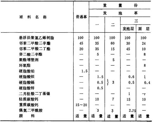 图8-1-25 基布底涂示意图 3.配方 聚氯乙烯人造革配方举例见表8-1-19。 表8-1-19 压延法人造革配方举例