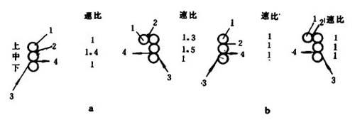 图8-1-26 擦胶法与贴胶法贴合辊速比示意图 a-擦胶法 b-贴胶法 1-压延机辊筒 2-塑料 3-基布 4-人造革