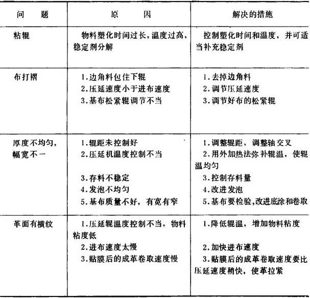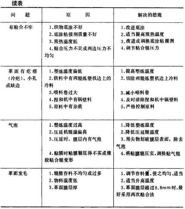 图8-1-27 贴胶法示意图 a-内贴法 b-外贴法 贴胶法有内贴法和外贴法两种。内贴法是在物料引离压延机辊前,借橡胶贴合辊与压延机最后一个辊筒间的压力将布基贴合上去的方法。外贴法是待物料引离压延辊后,利用单独一组贴合辊加压进行贴合的方法(图8-1-28)。 内贴法使聚氯乙烯物料在辊上停留时间增加,从而提高贴合牢度,但橡胶贴合辊处在高温下工作,易发生变形,而外贴法可延长橡胶贴合辊的寿命。 (2)温度控制 压延温度与压延速度有关。关于温度控制可参考第六章第二节。生产压延人造革时辊温一般较生产薄膜时稍低一些,大约控制在140~155℃。增塑剂较多的物料或加有发泡剂的物料,辊温不得超过150C。 (3)存料控制 生产压延人造革时,辊隙存料对质量影响很大,必须严格控制。存料量根据物料厚度不同,一般膜厚越厚,存料要求越多。膜层厚0.1mm时,Ⅰ、Ⅱ辊间存料量为30~35mm,Ⅱ、Ⅲ辊间15~20mm,川、Ⅳ辊间10~15mm。膜厚0.5mm时,Ⅰ、Ⅱ辊间存料量为80~100mm,Ⅱ、Ⅲ辊间存料量30~40mm,Ⅲ、Ⅳ辊间存料量10~20mm。 (三)操作中出现的问题、原因和解决的措施 操作中出现的问题、原因和解决的措施见表8-1-20。 表8-1-20 操作中出现的问题、原因和解决的措施