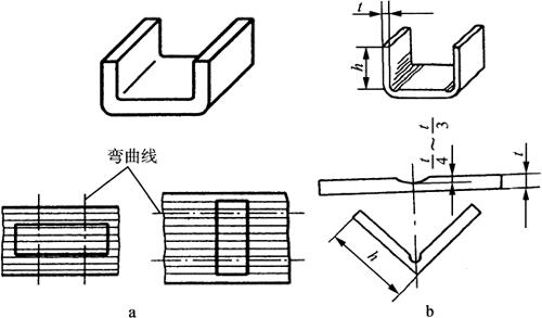 图9-35 弯曲方向与减薄弯曲 a.顺板纹弯曲 b.开槽减薄 表9-11 常用材料的最小弯曲半径rmin(t为板料厚度)