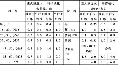 2.最小弯曲系数Kmin 最小弯曲系数Kmin是最小弯曲半径rmin与弯曲件厚度t的比值,又称为最小相对弯曲半径rmin/t,通常用Kmin=rmin/t作为衡量弯曲变形程度的主要指标。 实际生产中主要参照表9-12所示的经验数据确定最小弯曲系数值。表中材料的塑性愈好,弯曲变形的稳定性则愈强,当采用较小的弯曲系数时仍不易弯裂。 表9-12 常用金属材料的最小弯曲系数Kmin