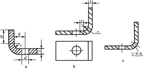 图9-37 弯曲件壁厚设计 a.无加强肋 b.有加强肋 3.弯边高度H设计 当弯边高度较小时,弯边在模具上支持的长度过小,不容易形成足够的弯矩,很难得到准确形状。因此,弯曲角为90°时,应使弯曲边高度H>2.0t,如图9-38a所示。否则,当弯曲处有凸缘时,为防止其尺寸突变尖角处应力集中产生裂纹,应改变形状使突变处离开弯曲线(图9-38b);或在弯曲处先压制槽口及工艺孔(图9-38c、d),再弯曲成型,或者加大此处的弯边高度h,待弯曲后再截去加高的部分。