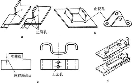 图9-40 工艺孔、槽等的形式 a.局部弯曲 b.突变处止裂孔 c.定位孔 d.冲口工艺 工艺孔、工艺槽及工艺缺口的尺寸,可按下式确定: 尺寸突变处距弯曲半径中心距离 K≥r 工艺槽或缺口的宽度 b≥t 工艺槽或缺口的深度 h=t+r+K/2 (2)冲口工艺及定位孔:压弯件的弯曲边缘有缺口时,为避免缺口部分变形分叉,应在缺口处留有连接带,待弯曲后切去。弯曲形状复杂或需多次弯曲的工件,为使毛坯在模具内准确定位,应预先作出定位工艺孔(图9-40c)。 另外,对于组合弯曲件可以采用冲口工艺,以减少组合件的数量,如图9-40d所示,原设计是用三个件组合而成,现采用冲口工艺制成整体零件,可以节省材料,简化工艺过程。 |