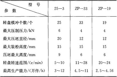 (二)粉末冶金专用压机的规格 1.转盘式压机(表6.2-26) 表6.2-26 转盘式压机主要技术参数