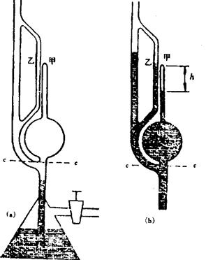 | 释义 | 压缩式真空计 压缩式真空计又称麦克劳真空计,图4.9-1(a),为压缩式真空计的工作原理示意图。通过汞的提升,对已知容积V内的待测压力P的气体进行压缩,一直到达已知截面积的毛细管内某一位置图4.9-1(b)形成了较高压力,使两根毛细管内的汞柱产生高差h,测出h值,并通过理想气体的波义耳定律,即可算出待测压力p。根据这一测量原理,可对压缩式真空计的汞柱高进行压力标定。其测量下限可扩展到高真空区域。但由于压缩容积不可能过大和毛细管不能过细,从而限制了测量下限。它是一种绝对真空计,可用作真空计量标准,在真空计量中占有重要地位。其压力准确度与本身各参量的测量准确度有关,例如毛细管中汞面的毛细压低值异常变化和封闭毛细管内气柱偏离理想圆柱体,是造成测量下限不确定度的最大因素。