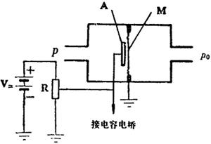 图4.9-1 麦克劳真空计工作原理示意图(a) (b) 我国从1959年到1977年先后研制了临时标准、一等标准到正式通过国家鉴定的基准压缩式真空计,其测量范围为0.001~1Pa,准确度为(2~0.2)%。 作为传递用的真空计有以下几种: 1.电离真空计 电离真空计是在有控制的条件下使待测气体的分子电离,并通过测量离子流来确定待测压力的一种相对真空计。所测得离子流大小与被测气体单位体积的分子数多少有关。由于不同种类气体分子的电离电位和电离几率不同,同样压力的不同气体所测得的离子流是不同的,因此这类真空计的测量与气体种类有关。电离真空计通常是由规管和控制单元两部分组成,规管内有敏感件,对气体分子进行电离并收集离子。控制单元提供规管工作电参数和显示真空度读数,在真空技术应用中,电离真空计的使用最广泛,尤其应用有高真空和超高真空范围。电离真空计的种类主要有热阴极电离真空计和冷阴极电离真空计。标准电离真空计1981年研制成功,并达到国际标准水平。其测量范围为(101~10-10)Pa,准确度等于10%。 2.热导式真空计 热导式真空计是根据气体在两个不同温度元件之间的热传导与压力有关而设计的一种相对真空计。根据气体热传导原理,当气体分子的平均自由程大于或接近这两个元件之间的距离尺寸时,气体热传导造成较高温度元件的热损耗与压力有关;当气体分子的平均自由程比该两元件之间的距离小时,气体热传导与压力无关,即限止了热导真空计的测量上限。当压力很低时,因气体很稀薄,气体的热传导量很小,使反应压力变化量的信号无法从本底噪音中检出,即限止了测量下限。这类真空计的测量范围在中、低真空区域。使用最广范的热导式真空计种类有电阻真空计(也称皮式真空计)和热偶真空计。 3.电容薄膜真空计 电容薄膜真空计的传感器原理示意图4.9-2,其内有一薄膜M,它将传感器内腔分为两侧。M和固定电极E之间形成一电容,pe为参考压力,P为待测压力。由膜片M变形后的电容量变化反应出传感器两侧压力差的变化,达到测压目的。另一种方法是在p>pe情况下,由于压差的作用,将膜片M弯向电极E。若在E和M之间加一直流电压使膜片复位,则由所加直流补偿电压反应出压力差的大小,达到测压目的。以上两种方法,均为差压式电容薄膜传感器。若将左侧密封,且满足pe<<p,则待测压力p为绝对压力值,就构成绝压式电容薄膜传感器。它实际上是数字压力计,我国引进美国产品作为中、低真空测量的仪器仪表。作为标准电容薄膜真空计需每年进行定度后才能使用。其测量范围在(105~10-1)Pa,准确度为3%。