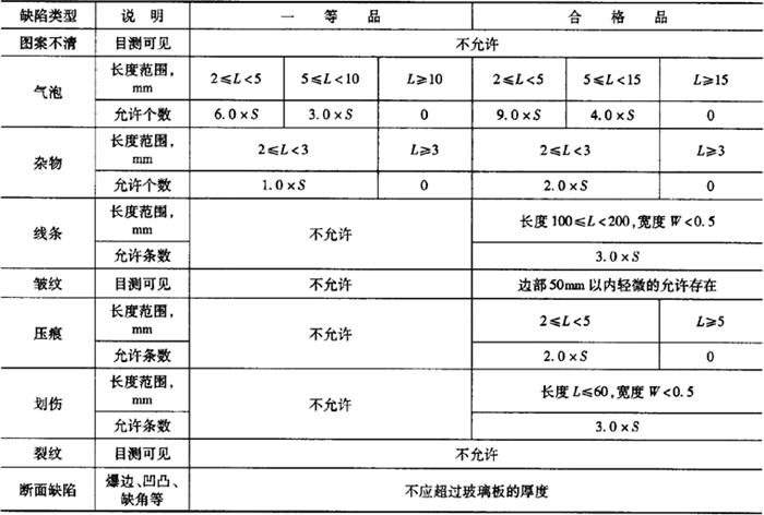 注:1.表中,L表示相应缺陷的长度,W表示其宽度,S是以平方米为单位的玻璃板的面积,气泡、杂物、压痕和划伤的数量允许上限值是以S乘以相应系数所得的数值,此数值应按GB/T 8170修约至整数;