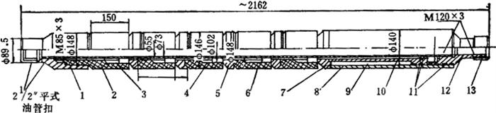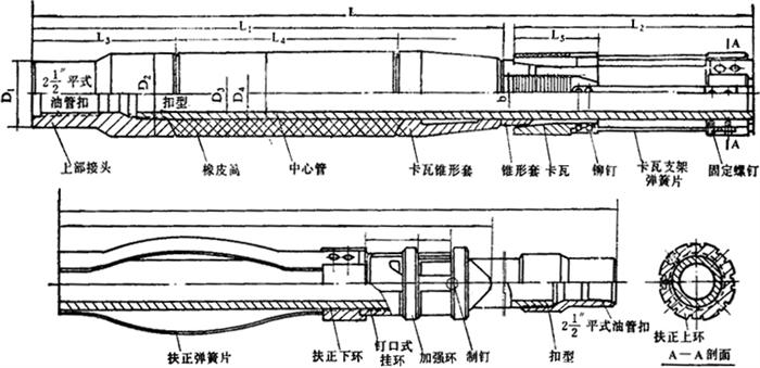 注:(1)工作压差:30MPa, (2)应用范围:适用在中深井,深井下有 (3)试泵:要求清水冷泵试压30MPa经15min不降。 (4)上部接头,7″卡瓦封隔器为310接头扣。 5″、6″、7″卡瓦封隔器结构见图3-3-57。