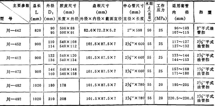 图3-3-59 庆457-8Ⅱ型封隔器 1-上接头 2-密封圈 3-胶皮筒座 4-胶皮筒 5-中心管 6-下接头 庆457-8Ⅱ型封隔器必须与定压单流凡尔配套使用,当油管内外造成0.5~0.7MPa的压差时,胶皮筒即可涨开,密封油、套管环形空间。 川442型等水力压差式封隔器主要技术数据见表3-3-40。 表3-3-40 水力压差式封隔器主要技术数据