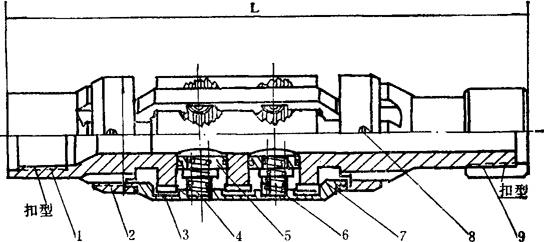 图3-3-62 水力锚扶正器示意图 1-主体 2-扶正块套 3-扶正块 4-弹簧(Ⅰ) 5-锚爪 6-弹簧(Ⅱ) 7-盘根 8-固定螺钉 9-护丝 表3-3-47 水力锚扶正器技术数据表