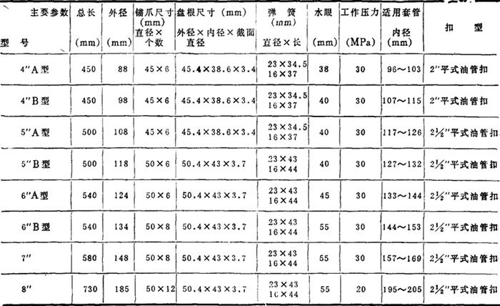 2.卡瓦式封隔器 优点:操作工艺简单;不要清理井底。 缺点:结构比较复杂;对套管有一定损坏;不能单独多级使用,但可与支撑式封隔器等组成多级。 用途:找水、堵水、压裂、酸化等作业。 卡瓦式封隔器技术规范见表3-3-36、3-3-37。 表3-3-36 卡瓦式封隔器技术规范