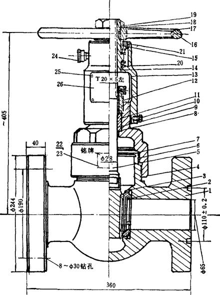 图3-3-63 Φ65×250大气压闸阀(CQ-250型采气井口) 1-阀体 2-阀座 3-闸板 4-闸盖 5-阀杆 6-O形盘根 7-自封圈 8-密封圈下座 9-密封圈 10-定位螺钉 11-密封圈上座 12-压帽 13-轴承座 14-O形密封圈 15-轴承盖 16-手轮 17-平键 18、19-螺母 20-单向推力轴承 21-定位螺钉 22-铭牌 23-铆钉 24-黄油杯 25-螺钉 26-盖板