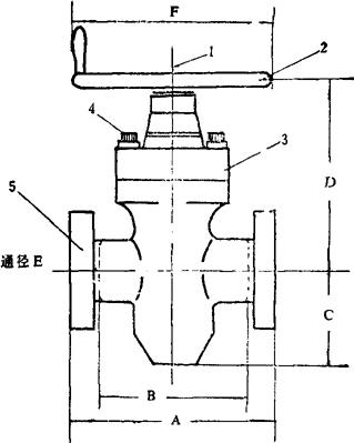 图3-3-64 “B”双手动闸阀示意图 1-手轮螺帽 2-手轮 3-阀盖 4-阀盖螺帽 5-阀体