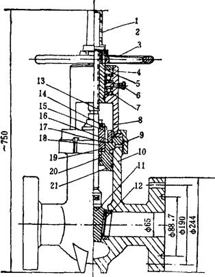 图3-3-66 65×600大气压闸阀 1-护罩 2-螺母 3-手轮 4、21-密封圈 5-轴承压盖 6-油杯 7-8212轴承 8-阀盖 9-大螺母 10-阀体 11-闸板 12-阀座 13-阀杆 14-压帽 15-圆螺母 16-预紧螺母 17-填料箱 18-回开环 19-密封环 20-垫环