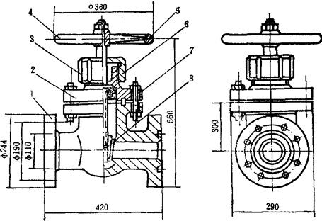 图3-3-67 Φ95×210大气压闸阀 1-阀体 2-上盖 3-压帽 4-阀杆 5-手轮 6-盘根 7-钢圈 8-闸板 表3-3-48 高压闸阀的有关数据