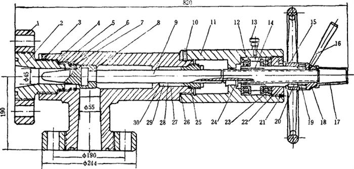 图3-3-70 Φ45×30MPa针阀 1-法兰 2-阀座压套 3、10、21-螺钉 4-针阀体 5、7、23、26、28、29-密封圈 6-阀座 8-阀针 9-阀杆 11-阀盖 12-轴承 13-油杯 14-阀杆螺母 15-手轮 16-手柄 17-护罩 18-并帽 19-螺母 20-键 22-轴承压盖 24-槽键 25-压帽 27-密封圈下座 30-垫片 |