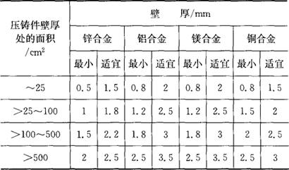 | 释义 | 压铸件的结构工艺性 压铸件的结构工艺性合理与否,关系到能否压铸出符合使用要求的高质量压铸件。 1.壁厚 在保证压铸件有足够强度和刚度的条件下,压铸件合理的壁厚应设计成薄壁和均匀壁厚,否则会导致铸件内部组织不均匀,也给压铸工艺的实施增加了困难。最大壁厚与最小壁厚之比不要大于3∶1。压铸件的壁厚通常根据压铸件面积而定,见表3.2-1。 表3.2-1 压铸件最小壁厚和适宜壁厚