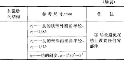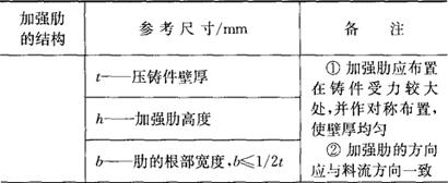2.加强肋 设置加强肋可增加铸件的强度和刚度,还可使金属液液流通畅和消除金属过分集中而引起的缩孔、气泡和裂纹等。表3.2-2列出了加强肋的结构及参考尺寸。 表3.2-2 加强肋的结构及参考尺寸