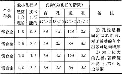 5.孔 对一些精度要求不高的孔,可以不必再进行机械加工。各种合金的压铸件可以压铸出的孔径及孔深如表3.2-5所示。凡是孔径小于表3.2-5内所列数值的孔,一般不宜直接进行压铸,而只压铸出定位的“洋冲眼”位置。 表3.2-5 压铸件的最小孔径及孔深 (mm)