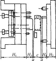 式中 Ps——压铸机的锁模力(N); Pz——压铸填充时,金属液对模具在锁模方向上的胀型力(N); k——安全系数(小铸件为0.85,中铸件为0.90,大铸件为0.95)。 对于胀型力Pz又可进行如下的计算: Pz=Pz1+Pz2 式中 Pz1——与在分型面上金属液的投影面积有关的胀型力(N); Pz2——由侧面胀型力引起的沿锁模力方向上的分力(一般主要计算活动块的楔紧装置的分力)(N)。 3.核算压铸机的开档尺寸 压铸机开档尺寸是压铸模设计时计算压铸模厚度和允许开模距离的依据。核算压铸机的开档尺寸计算图解,如图3.3-4所示。