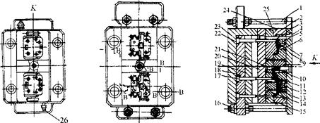 1.反推杆;2.定模套;3.导柱;4.导套;5.定模;6.定模板;7.芯;8.芯;9.冲模;10.浇口套;11.芯;12.芯;13.芯;14.动模;15.动模套;16.螺母;17.顶件杆;18.顶件支持板;19.顶件垫板;20.动模板;21.分流锥;22.顶件杆;23.底座;24.螺钉;25.保护板;26.水嘴