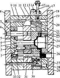 1.复位杆;2、3.推杆;4.推板;5.推杆固定板;6.推板导柱;7.推板导套;8.动模座板;9.垫块;10.销钉;11.支承板;12.动模套板;13.挡块;14、30、32、33.螺钉;15.弹簧;16.螺杆;17.成型滑块;18.定模套板;19.定模座板;20.楔紧块;21.斜销;22.动模镶块;23.定模镶块;24.定位销;25.型芯;26.浇口套;27.浇道镶块;28.导柱;29.导套;31.推杆