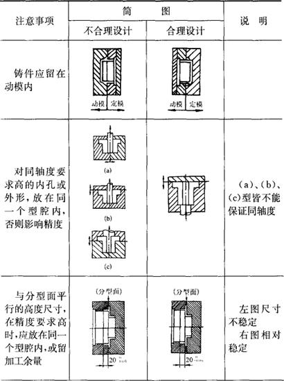 压铸模的动模和定模的接合面,称为分型面。选择分型面时的注意事项,见表3.3-2。