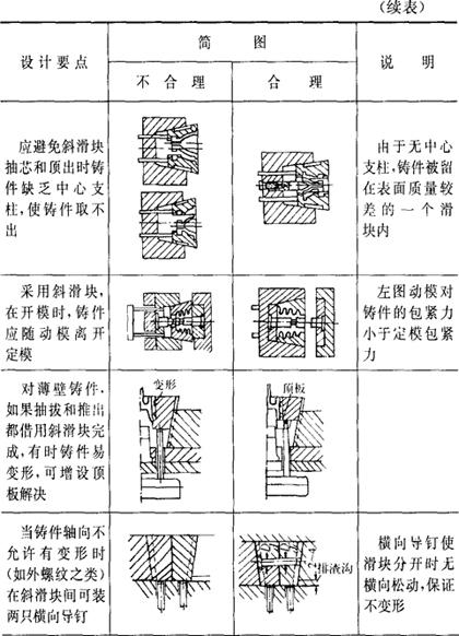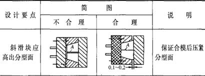 抽芯机构种类很多,现以最常用的斜滑块抽芯机构为例,说明其设计要点(表3.3-7)。