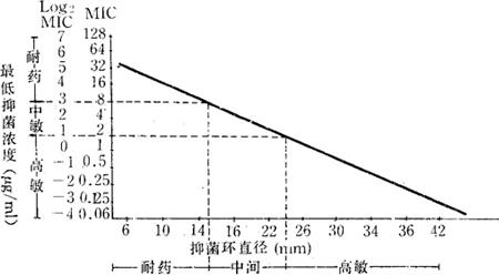 7.干燥纸片的含药浓度及其制备 (1)选择优抽新华1号滤纸制成直径为6mm的圆纸片。每200张一管,经干烤120℃2小时灭菌,保存备用。 (2)纸片内抗菌药物含量参考表2-3。 8.K-B方法回归曲线的绘制(以氯霉素要求为例) 将被测菌株的MIC转换成log2MIC对数值(双倍稀释法)和相对应的纸片法所得抑菌圈直径一对一对地点在坐标纸上,将数据作统计学上的相关回归分析,得截距a=6.49,斜率b=-0.22,相关系数γ=-0.76。MIC与抑制环直径呈负相关关系,即MIC愈小,抑菌环愈大,P<0.05,将此数据代入回归方程Y=a+bx,并做出代表此方程的回归线(图2-1)。