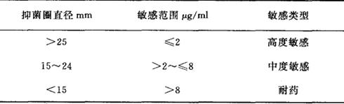 图2-1 氯霉素标准曲线(纸片浓度30μg/ml张) 9.细菌对氯霉素的敏感和耐药标准的划分 见表2-4。 表2-4 细菌对氯霉紊的敏感和耐药标准
