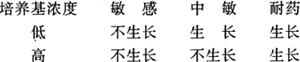 (3)简易法是做一高浓度和一低浓度2块平板培养基或用纸片,大致可以确定其小抑菌浓度(minimal inhibitory Concentration即MIC)和最小杀菌浓度(minimal bactericidal concentration即MBC),见表2-7。 表2-7 简易法常选择的药物浓度