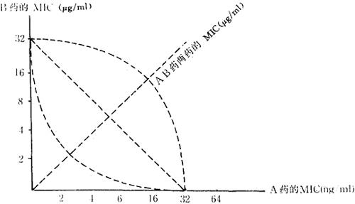 图2-2 以FIC求AB药的MIC (2)列三排稀释,第一排为A药系列,第二排为B药系列,第三排含不同浓度的A及B药。 (3)各孔加入105~106/ml菌液0.1~0.5ml,即等量的试验菌液。 (4)求A药的MIC(或MLC,minimal lethal concentration,即最小致死浓度),B药的MIC(或MLC)和A、B药的MIC,连线作图判断,或求FIC指数来判断联合试验结果。 药物抗菌试验的影响因素包括:①试验菌,最好采用临床新分离菌株,控制菌浓度为105~106/ml,接种量控制在0.1ml以内。②培养基,以WC或GAM培养基为准,pH控制在7.2左右。③抗菌药物,注意完全溶解和精确配制,注意中药中含鞣酸和色泽会影响透明度。 |