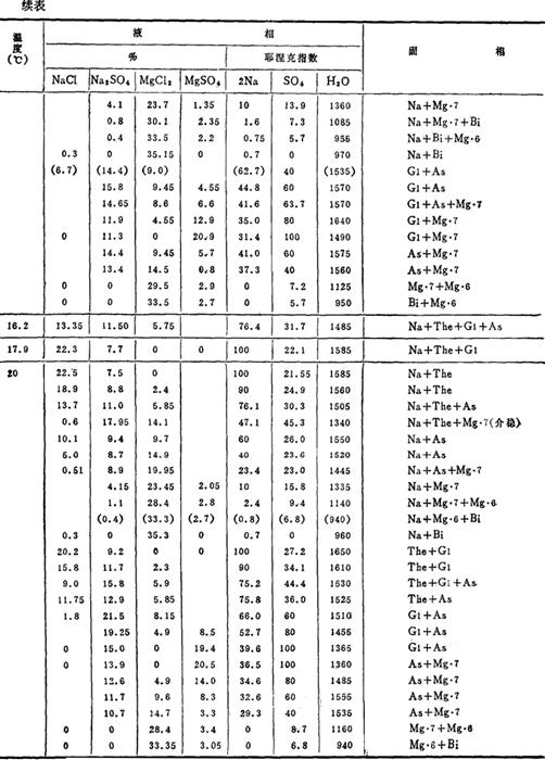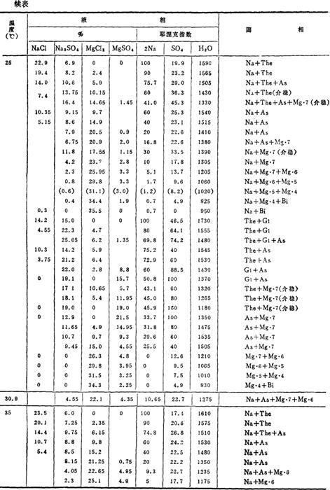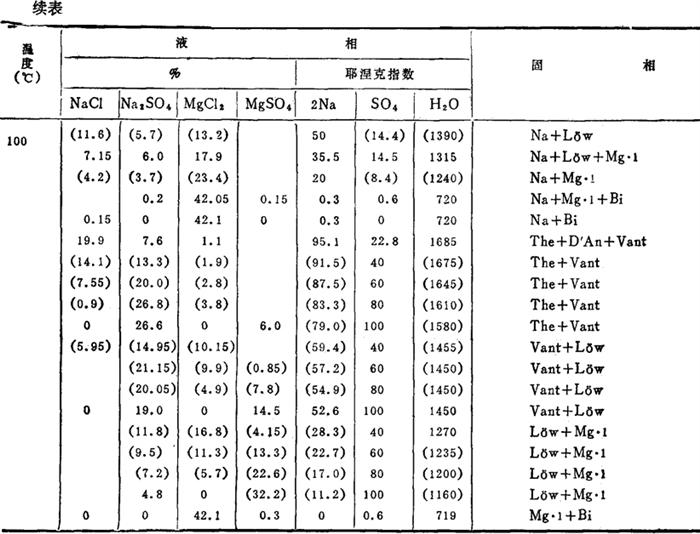 注:Na:NaCl Na·2:NaCI·2H2O Mg·8:MgCl2·8H2O The:Na2SO4 Mg·12:MgCl2·12H2O Gl:Na2SO4·10H2O Bi:MgCl2·6H2O Mg·1:MgSO4·H2O As:Na2SO4·MgSO4·4H2O Mg·4:MgSO4·4H2O D′An:9Na2SO4·MgSO4·3NaCl Mg·5:MgSO4·5H2O Vant:3Na2SO4·MgSO4 Mg·6:MgSO4·6H2O LÖw:Na2SO4·MgSO4· Mg·7:MgSO4·7H2O 根据表6-4-1的部分数据绘制图6-4-1A和图6-4-1B。