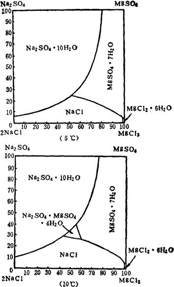 | 释义 | 原理 盐田卤水中含有丰富的NaCl、MgCl2、MgSO4、KCl和MgBr2等强电介质盐类。这些盐在卤水中都被电离成相应的阴阳离子(Na+、Mg2+、K+、C1-和SO42-)。在NaCl饱和前,KCl和MgBr2含量都很少,故此时卤水可看成是Na+、Mg2+//Cl-,SO42--H2O四元交互体系。NaCl和MgSO4在卤水中可发生下面的复分解反应: 2NaCl+MgSO4=Na2SO4+MgCl2 控制一定的温度、浓度、可使复分解反应向有利于生成Na2SO4的方向进行,并使其以Na2SO4·10H2O的形式自卤水中结晶析出。这一过程可由Na+、Mg2+//Cl-,SO42--H2O四元交互体系水盐相图进行分析。有关相图数据见表6-4-1。 表6-4-1Na+、Mg2+//Cl-,SO42--H2O体系相平衡数据
