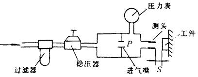 电容式传感器易实现非接触测量,具有高倍放大的特点,目前其最高分辨率为0.001μm。 3.气动式参量放大 气动式参量放大技术是将具有恒压的压缩空气通过气动测量头的喷嘴,并经喷嘴与被测工件之间的间隙逸入大气,当被测工件变化导致间隙变化时,喷嘴内的压力或流量产生相应的变化,如图3.3-11所示。气动式压力传感器的原理是,当被测尺寸5变化时,喷嘴测头处气阻发生相应的改变,因而引起气室内压力的变化,这种传感器的放大比为:
