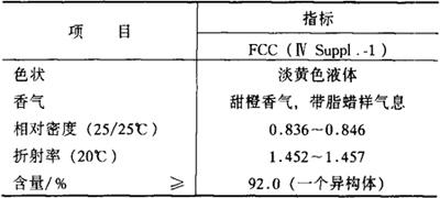 性状 稍黄色液体,溶于大多数固定油,不溶于水。沸点229℃(78~80℃/399.9Pa),闪点96℃。