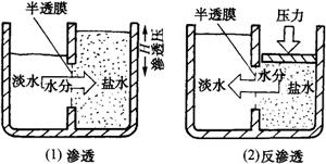 | 释义 | 反渗透器 (一)反渗透原理与特点 如图4-12-7所示,在一个容器中,用一层半透膜把容器分隔成两部分。一边注入淡水,另一边注入盐水,并使两边液位相等,这时淡水会自然地透过半透膜至盐水一侧。盐水的液面达到某一高度后,产生一定压力,抑制了淡水进一步向盐水一侧渗透。此时的压力即为渗透压。如果在盐水一侧加上一个大于渗透压的压力,盐水中的水分就会从盐水一侧透过半透膜至淡水一侧,这一现象就称为反渗透。