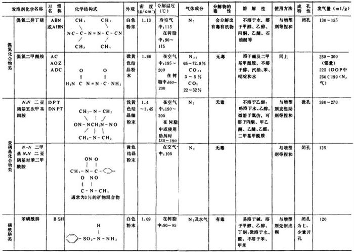 二亚硝基五次甲基四胺类发泡剂必须与尿素类分解助剂同时使用。根据分解助剂的使用量,分解温度可调节在70~200℃之间,发气量为每克260ml。正确选择和充分利用这类发泡助剂可防止发泡分解而引起意外的危险,并可调节分解速度、分解温度和发气量。此外,制品的恶臭和着色也可以得到改善,这是由于发泡助剂的分解生成物与发泡剂二亚硝基五次甲基四胺分解生成物进行二次反应,有着除臭和防污作用的缘故。 (三)发泡剂的特性 常见有机发泡剂的特性见表2-5-7。 表2-5-7 常用有机发泡剂特性表