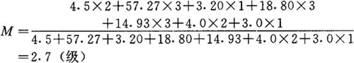 式中:M为病虫综合发生程度(级),Ai表示某单项病虫发生面积,Ci表示相对应的某单项病虫发生级别。 将上列数字代入: