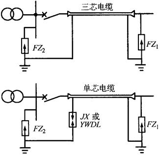 图11-18 35kV架空进线变电所的防雷措施 FZ为阀型避雷器;GB为管型避雷器 (2)电缆进线的变配电所。电缆与架空线的连接处装设阀型避雷器,其接地端与电缆金属外皮相连,三芯电缆末端的金属外皮直接接地(见图11-19a),单芯电缆则经空气间隙或无间隙金属氧化物电缆保护层保护器(YWDL)接地(见图11-19b)。