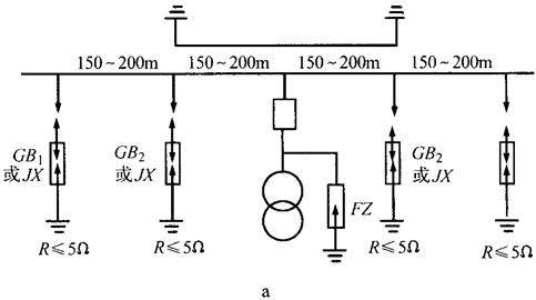 图11-22 3150kVA及以下变电所供电给非重要负荷时35kV侧的简化防雷措施 a.当变压器的容量在1000~3150kVA之间时 b.当变压器的容量为1000kVA及以下时 FZ为阀型避雷器 GB1、GB2为管型避雷器 JX为空气间隙 (3)3150kVA及以下35kV非重要负荷的分支变电所可采用图11-23所示保护措施。