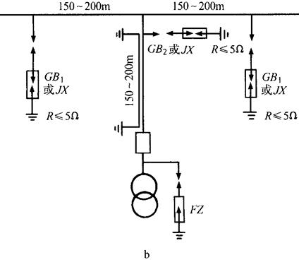 图11-23 3150kVA及以下,供电给非重要负荷的分支变电所的35kV侧防雷措施 a.在给变压器供电线路分支点两侧设有架空避雷线 b.在变压器供电线路上设有架空避雷线 图11-21~图11-23中的避雷器、变压器和电流互感器的最大电气距离不超过10m。 |