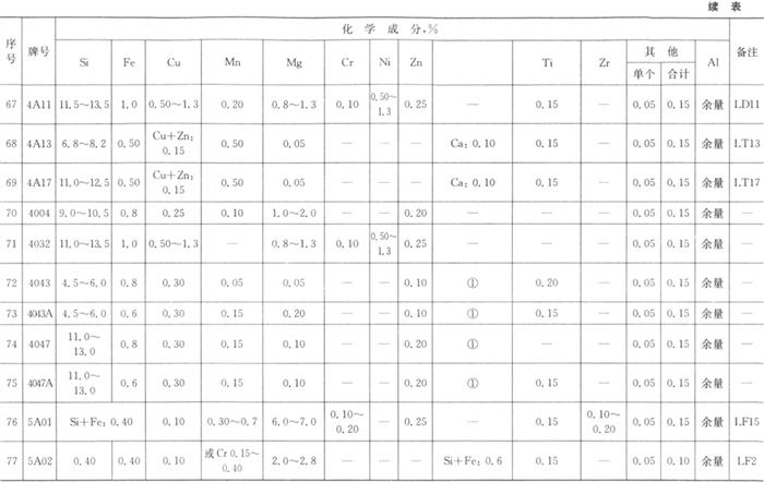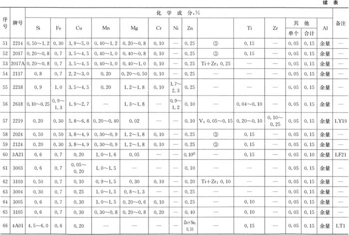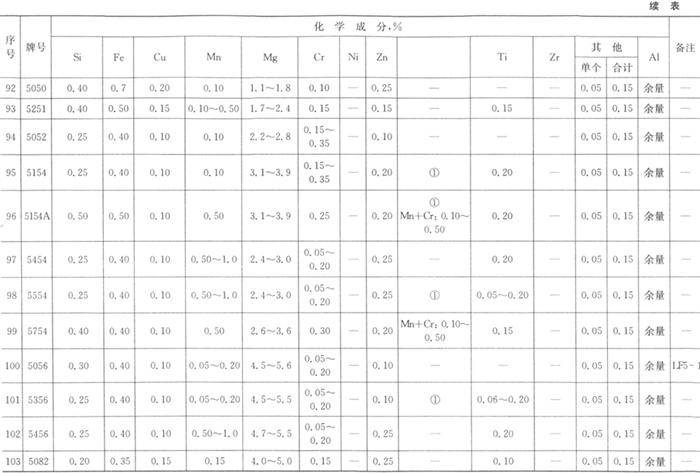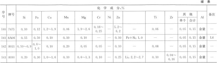 表9.1-3列出了按GB/T 3190-1996标准制订的中国变形铝合金的化学成分,该表适用于以压力加工方法生产的铝及铝合金产品(板、带、箔、管、棒、型、线和锻件)及其所用的铸锻和板坯。表中,含量有上下限者为合金元素,含量为单个数值者为最高限。“其他”一栏系指未列入或未规定数值的金属元素。表头未列出的某些元素,当有极限含量要求时,其具体规定列于空白栏中。