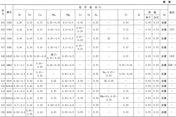 ⑤仅在供需双方商定时,对挤压和锻造产品限定Ti+Zr含量不大于0.25%。