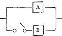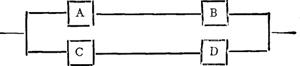 图3-8 串-并联贮备系统 其可靠度预测公式为: R系统=1-(1-RA·RB)(1-RC·RD) 当分系统的可靠度相同时,上式可简为: R系统=1-(1-R2)2 例:图3-8系统中 RA=RB=RC=RD=0.9 求此系统的可靠度。 R系统=1-(1-0.92)2=0.9639 (4)非工作储备并联系统可靠性预测。非工作贮备系统亦称待机工作系统或冷贮备系统。是指在工作的部件未失效之前,它们不参加工作,处于等待状态,当工作的单元一旦失效,它们马上接上去工作。这种系统的可靠性可大大提高。 对于只有一个非工作贮备单元的情况(见图3-9),系统的可靠度预测公式为: