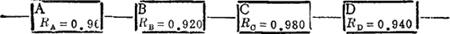 例:有两个单元,每个单元的失效率为:λ=0.001次失效/小时,其中一个工作,一个非工作贮备,100小时工作期间,求它的可靠度。 解1按公式有: R=e-λt+λte-λt=e-λt(1+λt) 而 λt=0.001×100=0.1 故 R=e-0.1(1+0.1)=1.1×e-0.1≈0.995 (二)可靠性分配 所谓可靠分配就是使用一定的数学方法,把系统的可靠性指标合理地分配给分系统、部件的过程。可靠性分配的目的,主要是落实系统的可靠性指标和各分系统或部件的可靠要求,或通过分配找出薄弱环节,为改进设计提供依据。 可靠性分配是按系统→分系统→部件→元器件这样自上而下的分配。它正与可靠性预测相反。一般地说,可靠预测是可靠性分配的基础,它先于可靠性分配。但由于某种原因,在分配过程中也会有预测→分配→再预测→再分配的循环过程。 下面仅以串联系统的可靠性分配为例,说明可靠性一般步骤: (1)用F=1-R公式求出各部件预测的不可靠度。 (2)把系统允许的不可靠度与各部件预测的不可靠度的和作比较。 (3)将第(2)项所得的比例因子与各部件预测的不可靠度相乘,求出各部件允许的不可靠度。 (4)用R=1-F公式,求出对各部件所需求的可靠度。 例:有一个由A,B,C,D四个分系统组成的系统(图3-10)要求其可靠为0.9,现把这个指标分配给这四个系统,看是否满足要求。