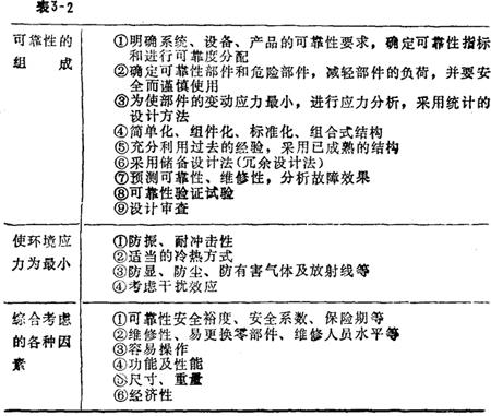 图3-10 由四个分系统组成的系统 解:此系统的可靠度为0.9,则不可靠度为: F=1-0.9=0.1 1)先求出各分系统的不可靠度: A=1-0.960=0.040 B=1-0。920=0.080 C=1-0.980=0.020 D=1-0.940=0.060 各个分系统不可靠度之和为: 0.040+0.080+0.020+0.060=0.20 (2)将各分系统预测的总不可靠度与系统允许的不可靠度进行比较,结果为0.10/0.20=0.5。 (3)把所得的比例因子(0.5)与各分系统预测的不可靠度相乘,得出各分系统允许的不可靠度,即: A→0.04×0.5=0.02 B→0.08×0.5=0.04 C→0.02×0.5=0.01 D→0.06×0.5=0.03 (4)应用R=1-F公式,求出各分系统所要求的可靠度指标,即: A→1-0.02=0.98 B→1-0.04=0.96 C→1-0.01=0.99 D→1-0.03=0.97 再用串联可靠性预测公式得系统可靠度: 0.98×0.96×0.99×0.97=0.9035 满足例意可靠度为0.90的要求,至于多余量0.0035一般不再分配。 (三)提高可靠性的具体措施 提高可靠性设计的措施很多,这里只介绍对任何设计都具有普遍意义的措施。 1.耐环境设计 在耐环境设计中,首先要估计或确定设备的工作环境,然后看在该环境下设备和元器件、零部件能不能满足可靠性要求,如果不能,就要在设计上采取防护措施。耐环境设计包括耐振设计、防热设计、防腐蚀和防潮设计、防辐射设计、防霉菌设计以及防盐雾设计。 2.维修性设计 维修性设计是考虑便于维修保养所采取的设计措施和方法。它考虑的方面有可达性、装配方法、部件的组件化与小型化、测试点和检测设备方便等。可达性是指在维修时容易看到维修的目标点,并能将手或工具伸进去操作的性质。从装配方法看,要考虑把故障率高的零部件放在装拆时间短的位置。复杂设备在设计中需合理配置测试点。 3.人-机系统设计 人和机器之间有着极为密切的相互配合、相互制约和相互作用的关系。在设计中合理考虑人的因素,对提高系统的可靠性起着重要的作用。如一个由单人单机组成的系统其可靠度为: RS=RHRM 式中RH为人的可靠度;RM为机器的可靠度。为了提高系统的可靠性,设计中需要从空间方面、动力学方面、信息方面去考虑人的因素,对提高系统的可靠性起着重要的作用。 现在,我们把可靠性设计所涉及到的各个方面编制成表3-2。 可靠性设计要求、因素表