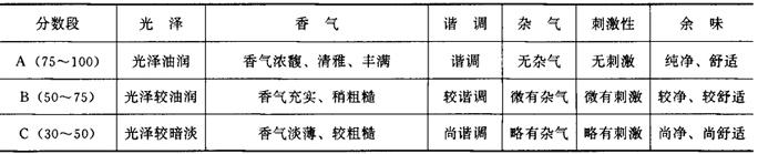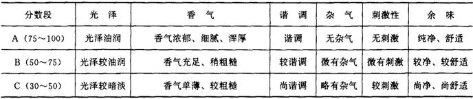 | 释义 | 叶组配方设计依据 卷烟叶组配方以产品的类型、质量风格、消费者的喜好与卷烟生产成本为依据,结合烟叶的品种、等级、质量特点以及与感官质量相关的化学成分经过反复试验筛选而确定。 (一)卷烟产品的类型 我国卷烟产品划分为以下几种类型: (1)烤烟型卷烟。烤烟型卷烟的烟气具有明显的烤烟香气,香气清雅或浓郁,烟碱含量相对较低,吸味较柔和。其配方特点是全部或绝大部分以烤烟烟叶为原料。 (2)混合型卷烟。混合型卷烟的烟气具有烤烟与晒晾烟混合均匀谐调的香气,香气浓郁,烟碱含量相对较高。其配方特点是以烤烟、白肋烟、香料烟或其他晒晾烟为原料。 (3)外香型卷烟。外香型卷烟的烟气具有独特的外加香香气。其配方结构既可全部使用烤烟,也可根据需要掺配部分晒晾烟。由于外加香突出,外香型卷烟可以选用等级相对较低的烟叶原料。 (4)雪茄型卷烟。雪茄型卷烟烟气中具有雪茄烟特有的香气。这种香气主要来源于雪茄型烟叶及其他晒晾烟。 (二)卷烟的感官质量因素及风格特点 卷烟的感官质量一般概括为香、味、色。主要是香气、杂气、刺激性、余味、光泽、谐调。卷烟风格特点包括香气风格、烟味浓度和劲头。卷烟的感官质量因素及风格特点取决于叶组配方中各种烟叶的烟质特点及相互配合作用。 (1)香气:卷烟香气是指卷烟烟气本身所固有的烟草特具的芳香。香气有质和量的双重含义。不同等级的卷烟对香气的质和量要求不同,进行配方设计时应有针对性地选择烟叶类型和等级。 (2)谐调:指卷烟香气和谐一致,感觉不出其中某一单体的特性,如加香加料与烟香调和、叶组配方中各烟叶间的调和。 (3)杂气:非烟草本质气味的、轻微的和明显的不良气息。如青草气、枯焦气、土腥气、松脂气、花粉气、木质气和地方性杂气等。卷烟感官质量越高,要求杂气越少。 (4)刺激性:烟气对感官造成的不适感受。如对鼻腔、口腔及喉部的冲刺,毛棘火燎等。卷烟感官质量越高,要求刺激性越小。卷烟刺激性受烟叶本身质量影响,与工艺处理关系也较为密切,尤其是混合型卷烟。 (5)余味:指烟气从鼻腔或口腔呼出后,遗留下来的味觉感受。它包括口腔内的干净程度和舒适程度。 (6)光泽:指烟丝的油润程度。它与卷烟吸味品质有很密切的关系。烟丝光泽除与烟叶光泽有关外,在很大程度上还取决于工艺处理质量。 (7)劲头:劲头又称生理强度,是烟气对喉部的冲激强度。它不是卷烟的质量指标,而是卷烟风格的一种表现,也是消费者选择卷烟牌号的重要依据。 (8)浓度:烟气浓度是指在口腔中感觉到烟气量的多少,也是卷烟风格的一种表现。 (9)香气特性:是指卷烟烟气的香味特征。由于卷烟配方结构不同而产生的香气清雅,或香气浓馥;香气清新、丰满,或香气浓郁、醇厚;或由加香加料不同所产生的香气浑厚、充实、充足或细腻等特征。香气特征也是消费者选择卷烟牌号的重要依据。 (三)不同段位卷烟对烟质要求 卷烟分数段是衡量卷烟感官质量的技术要求。不同段位的卷烟售价不同,对质量要求也不同。制订各分数段位质量标准是叶组配方的基本依据,同时也是对产品的感官质量进行技术监督的重要依据。我国各类型、各分数段位卷烟感官质量,详见表6-2-1,表6-2-2,表6-2-3,表6-2-4。 表6-2-1 烤烟型卷烟感官质量技术要求