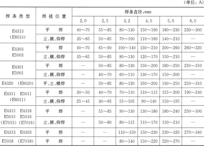 每一种碳钢焊条的性能和特点均有所不同,如焊接电流范围、焊条再烘干制度等。随着焊接条件的变化,焊接电流大小也应有所改变。如工件预热后焊接电流可比不预热时减少5%~15%,采用直流电源时可比交流电源减少10%左右;立焊和仰焊时可比平焊减少10%~15%。碳钢焊条施焊时所适用的焊接电流范围汇总于表1.2-13。 表1.2-13 不同类型焊条适用的电流范围